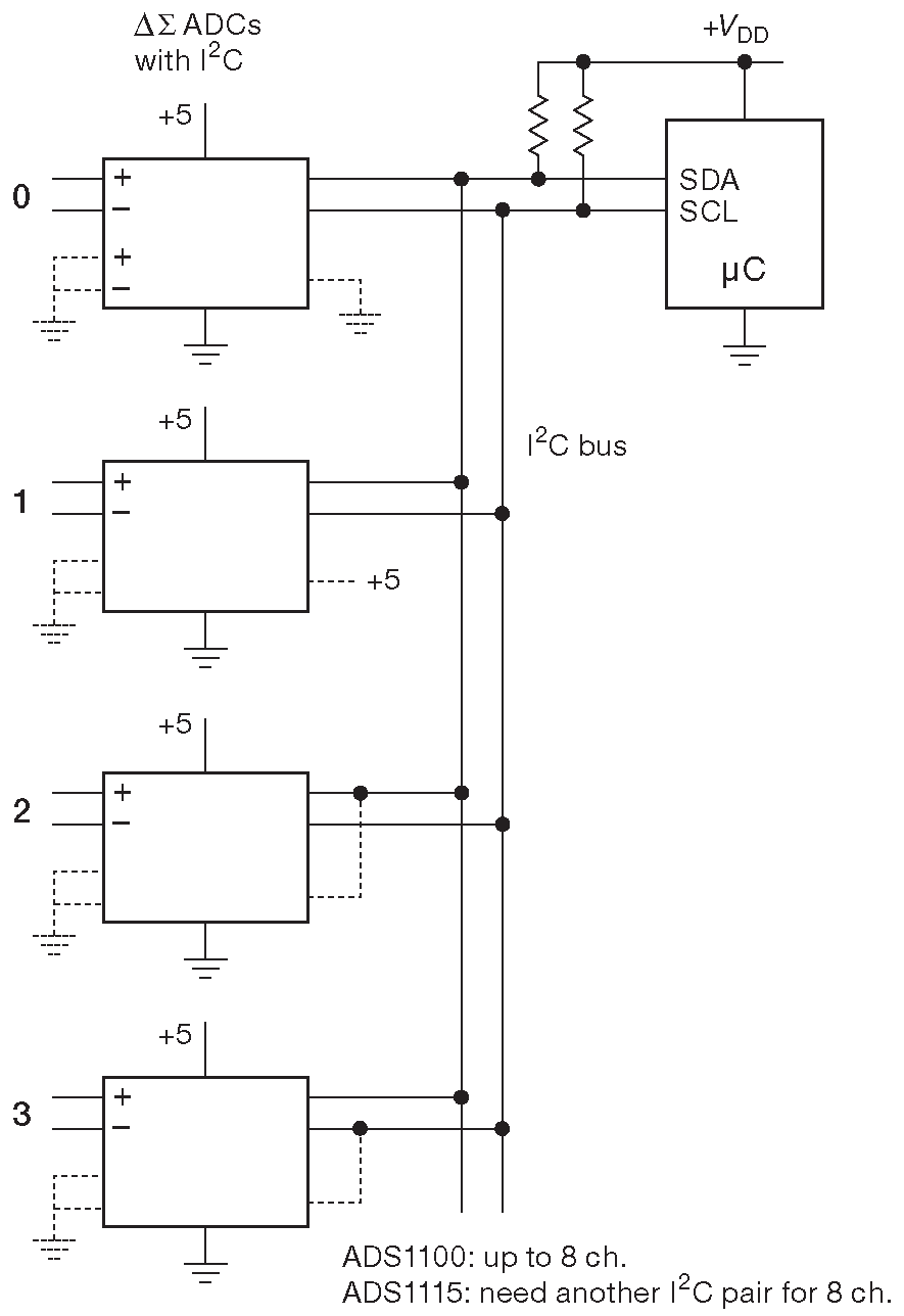 Рис. 13.81 Многоканальная параллельная ΣΔ система сбора данных на шине I²C. Пунктиром отмечены соединения для ADS1115