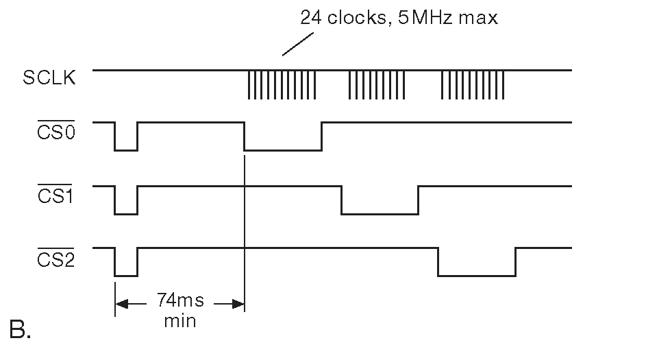 Рис. 13.82 Многоканальная параллельная ΣΔ система сбора данных с шиной SPI ( CS5512 или MPC3551 ). Временная диаграмма относится к семейству MPC3551, в котором первый импульс на выводе выбора кристалла ( «/CS» ) инициирует измерение ( одновременно по всем каналам ), а считывание данных происходит при повторной активации «/CS»