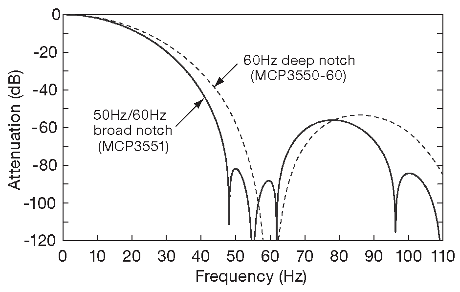 Рис. 13.83 Цифровой фильтр в MCP3551 устроен так, чтобы в полосу заграждения попадали одновременно частоты 50 и 60 Hz и ещё немного. Варианты MCP3551-50 и MCP3551-60 настроены на одну конкретную частоту, но подавляют её лучше