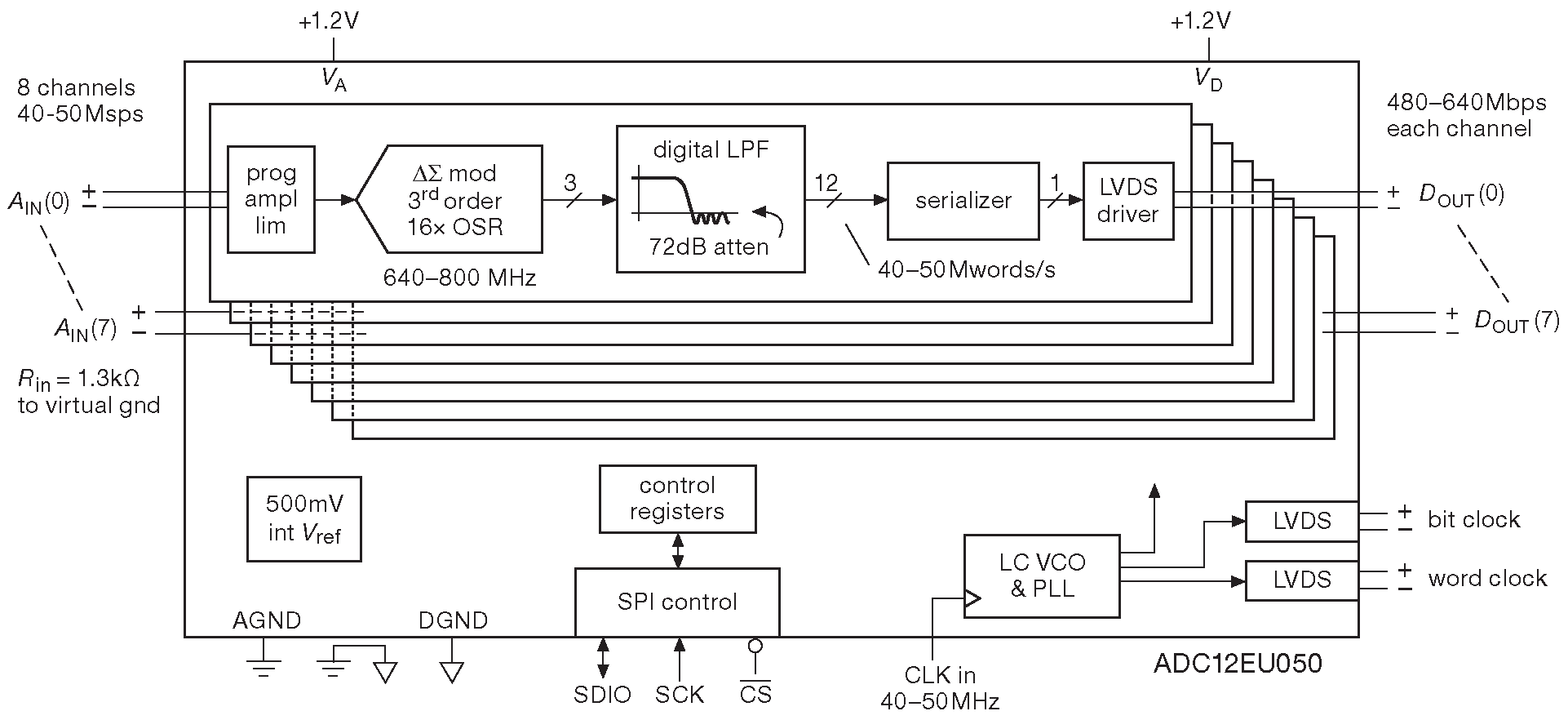 Описанные схемы работают неторопливо: всего 15 выборок в секунду ( у AD73360 скорость на три порядка выше, но меньше разрешение и точность ). А что можно сказать о быстром многоканальном ΣΔ преобразовании? Поднять скорость в миллион раз очень сложно. Сложно, но всё же возможно: ADC12EU050 фирмы National Semiconductor/TI ( рис. 13.84 ) содержит в одном корпусе восемь 12-разрядных ΣΔ с дифференциальными входами, работает на скорости 50 Msps (!). Каждый канал имеет свой собственный цифровой выход в виде LVDS пары. Микросхема потребляет 0.4 W и стоит около $100.
