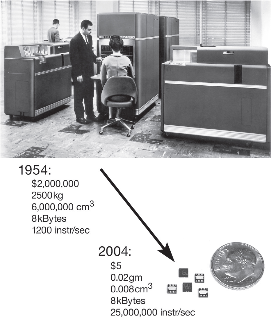 Рис. 14.1 От мэйнфреймов до микроконтроллеров: 50 лет прогресса компьютеров ( фотография мэйнфрейма является собственностью корпорации IBM )