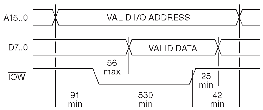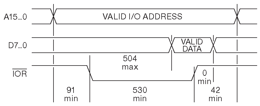 В ходе исполнения инструкции «IN AL, 200h » ЦПУ выдаёт на линии «A9...A0» адрес \(200_{16}\) ( шестнадцатиричное число 200 , которое иногда пишут как 0x200 ), выдерживает театральную паузу и активирует на 530 ns сигнал «IOR'». По заднему фронту «IOR'» процессор фиксирует состояние линий «D7...D0», после чего снимает адрес с «A9...A0». Периферийное устройство обязано выставить данные на «D7...D0» не позднее, чем за 26 ns до заднего фронта «IOR'». Это очень мягкие требования, т.к. запрос выставляется за 504 ns до дедлайна. С учётом типичного времени распространения 10 ns указанные 504 ns кажутся вечностью ( и однозначно определяют эпоху рождения шины - 1981 - времена, когда были иные представления о быстродействии ).