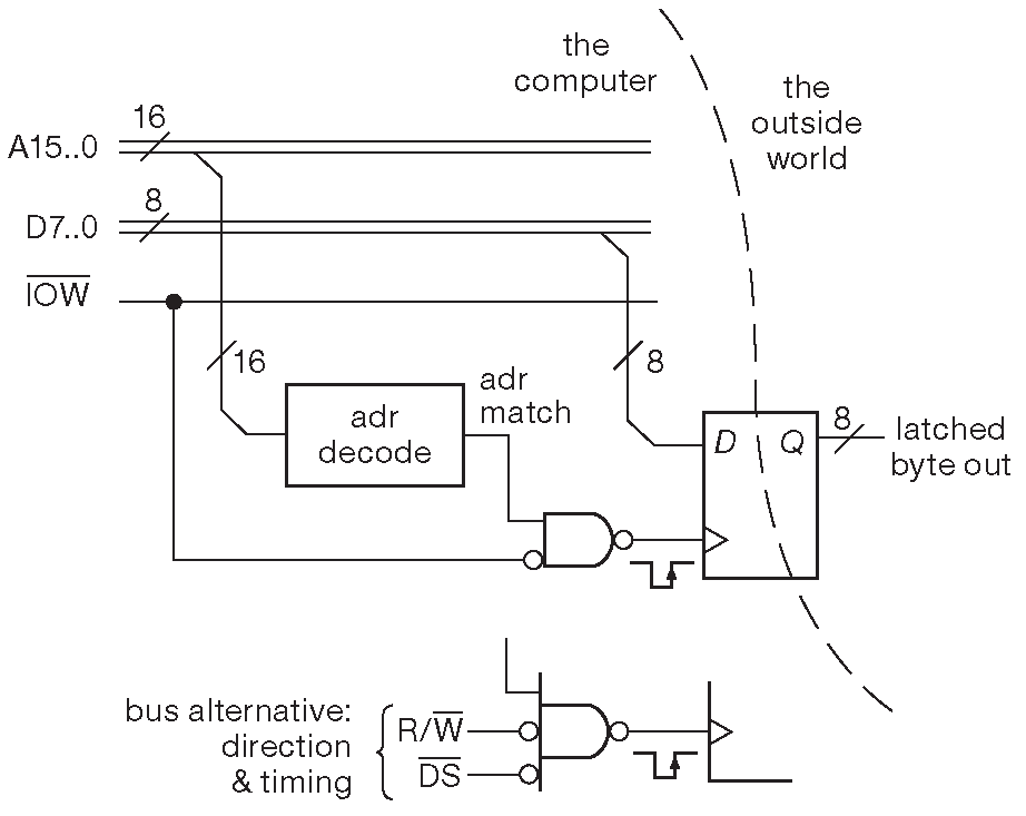 Описанная логика показана на блок-схеме 14.9 . Прямоугольник с надписью «adr_decode» выдаёт ВЫСОКИЙ уровень на линии «adr_match», когда на «A15...A0» появляется назначенный блоку адрес. [* На схеме имена написаны без подчёркивания, но подобной формы следует избегать. Современные системы разработки софта и аппаратуры крайне негативно относятся к пробелам в именах переменных или путях к файлам, поспринимая такие пробелы как разделители параметров. С подчёркиванием вы не попадёте «в непонятное» ] . ВЫСОКИЙ «adr_match» разрешает прохождение НИЗКОГО состояния «IOW'» через вентиль. Задний фронт «IOW'» защёлкивает данные с «D7...D0» в 8-разрядном регистре D-типа. Процесс можно описать короче: «данные защёлкиваются в регистре по сигналу записи, одобренному адресной логикой». Отметим, что для записи в регистр используется задний фронт «IOW'». Это обязательное условие, потому что на переднем ( спадающем ) фронте данных на линии ещё нет, а вот на заднем их правильность гарантируется. Фактически имеем время установления ≥474 ns и время удержания ≥25 ns относительно восходящего фронта. На схеме есть альтернативный участок для набора сигналов «направление-строб» фирмы Motorola ( «R/W'» и «DS'» ) вместо «интеловской» пары «IOW'», «IOR'».