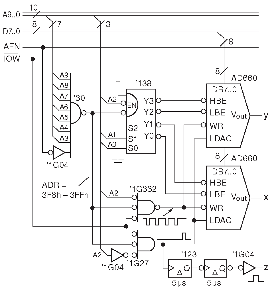 В данном случае используется блок адресов длиной 8 байт с 3F8h по 3FFh ( двоичное представление 11 1111 1xxx ), где 3F8h ( 11 1111 1000 ) используется в качестве базового. 8-входовой элемент «И-НЕ» фиксирует факт попадания в заданный диапазон адресов ( с учётом НИЗКОГО состояния «AEN» ) 18 . Выход «8И-НЕ» разрешает работу дешифратора 1-на-8 ’138 ( §10.3.3.D ), который обслуживает две младшие адресные линии «A1» и «A0», выбирая «LBE'» или «HBE'» одной из двух соседних микросхем при обращении к адресам 3F8h, 3F9h, 3FAh и 3FBh . Загруженные данные передаются в выходные регистры ЦАПов в момент выполнения записи по адресу 3FCh 19 : в этот момент активируется сигнал «LDAC» ( LoadDAC ), и стартует формирование задержанного сигнала «z». Последний разрешает отображение точки на векторном дисплее, а задержка нужна для полного установления аналоговых координат с ЦАПов. Отметим, что при обращении к адресу 3FCh состояние линий данных игнорируется.