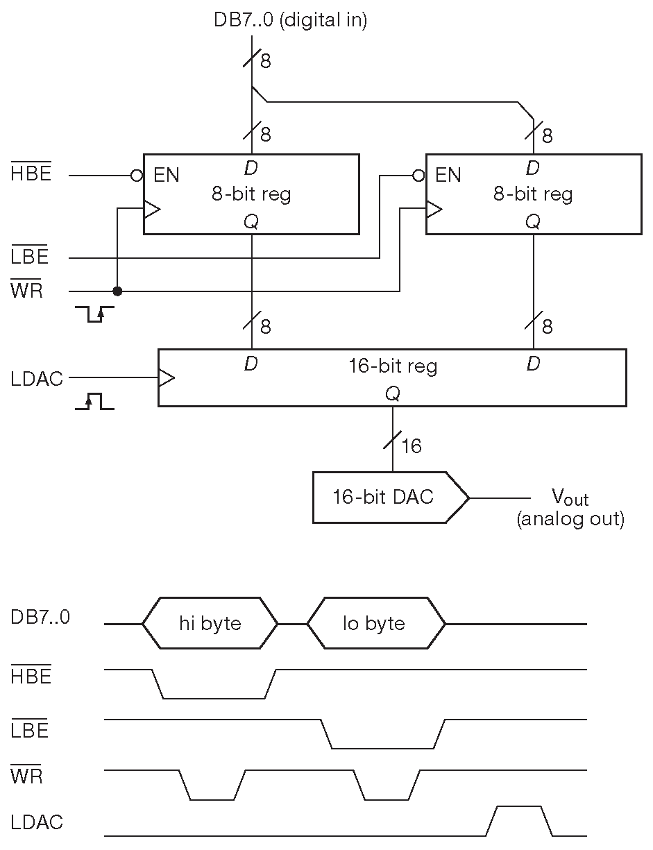 ЦАПы AD660 ( Analog Devices ) имеют пару регистров шириной один байт, управляемых входами разрешения загрузке «LBE'», «HBE'» и тактируемых от линии «WR'». 8-разрядное содержимое передаётся в 16-разрядный регистр, который отвечает за уровень выходного напряжения ( рис. 14.11 ). Такая двухстадийная схема предохраняет от ложных изменений на аналоговом выходе. С ней можно переслать 16-разрядное число побайтно, а затем разом выдать его на преобразователь. Схема, конечно, чуть сложнее, чем простая запись одного 8-разрядного значения в выходной порт ( рис. 14.9 ).