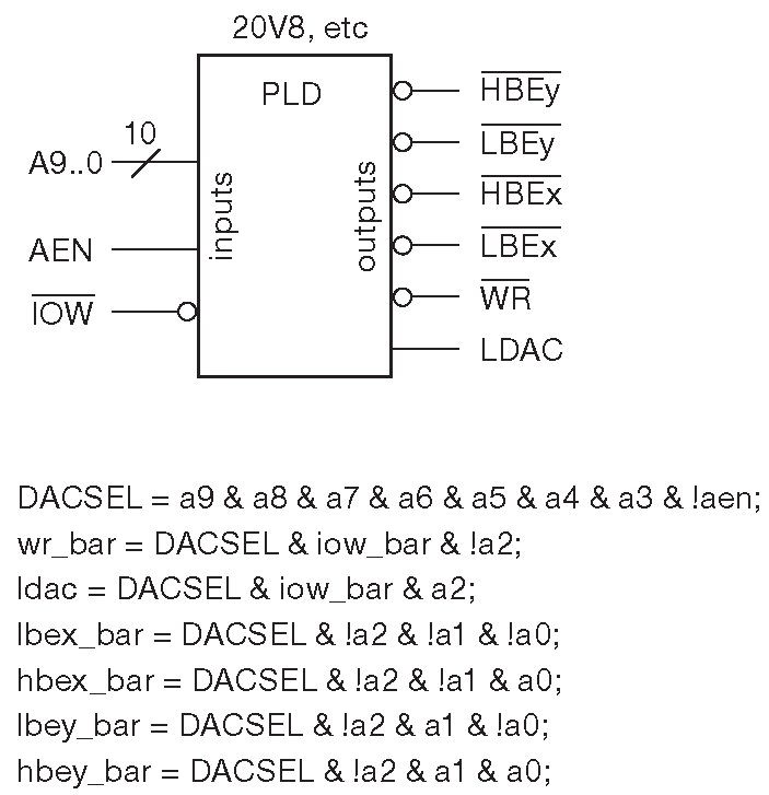 Рис. 14.12 Вся логика схемы 14.10 легко помещается в мелкую PLD 20V8. Логические уравнения построены в предположении, что управляющие сигналы имеют активный НИЗКИЙ уровень. Данный факт отражается в заголовочном файле