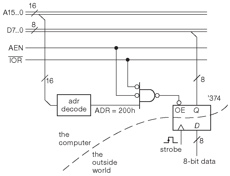 Обратное направление обмена данными - чтение ( «IN» ) - выглядит аналогично. Абонент смотрит на линии «A9...A0», и, если их состояние ( вместе с НИЗКИМ уровнем «AEN» ) соответствует его собственному адресу, выдаёт на шину данные при низком уровне на линии «IOR'» ( рис. 14.13 ). На рис. 14.14 показана замечательно простая блок-схема, выполняющая данную задачу. Интерфейс позволяет процессору считывать данные, защёлкнутые в ИМС ’374 - регистре D-типа с третьим состоянием выходов 22 . Тактовая линия и входы находятся в ведении периферийного устройства, поэтому через такой шлюз можно передавать любые цифровые данные, например, отсчёты АЦП. Линия, подписанная «ADR=200h», идёт с адресного дешифратора. В таком качестве может выступать PLD или несколько вентилей жёсткой логики, которые выдают ВЫСОКИЙ уровень, когда «A9...A0» имеют состояние «10 0000 0000». Конкретная реализация схемы остаётся в качестве задачи читателю.