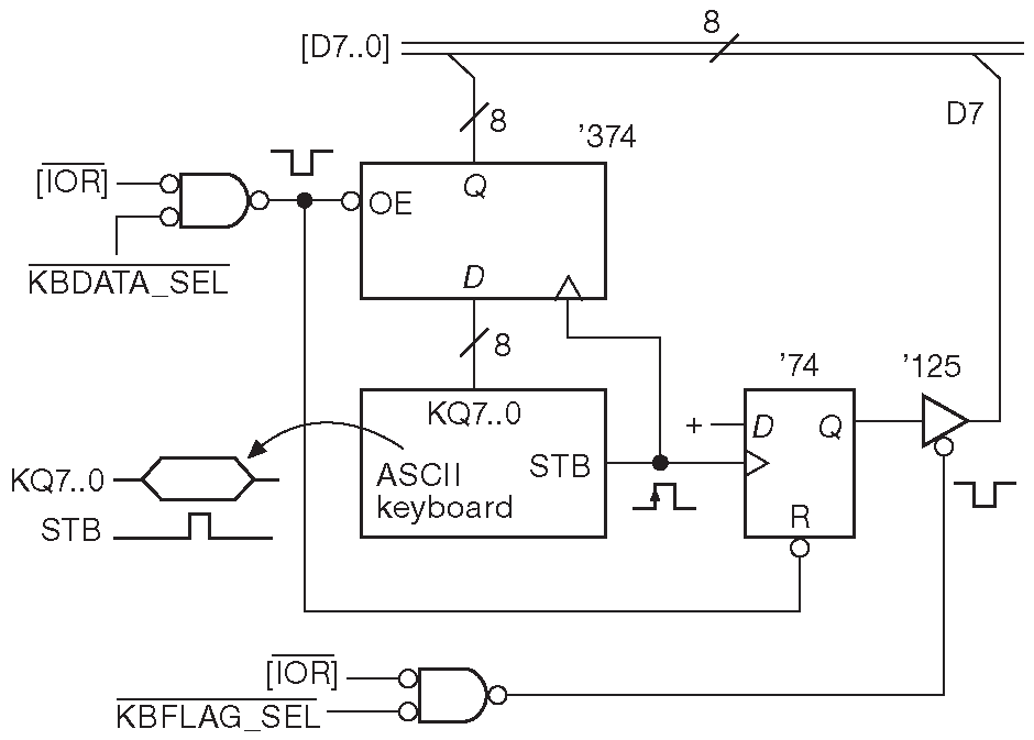 В данном случае «ASCII_keyboard» - простейшее устройство, которое выдаёт код нажатой клавиши на линии «KQ7...KQ0» в сопровождении стробирующего импульса «STB» 23 . «STB» ( “strobe” ) используется для защёлкивания 8-разрядного кода символа в регистре. Выходы регистра имеют Z-состояние и позволяют подключаться к линиям DATA напрямую. Сигнал «KBDATA_SEL'» приходит со схемы декодирования адреса и переключается в НИЗКОЕ состояние, когда линии «A9...A0» принимают нужное состояние ( в сопровождении НИЗКОГО уровня на «AEN» ).