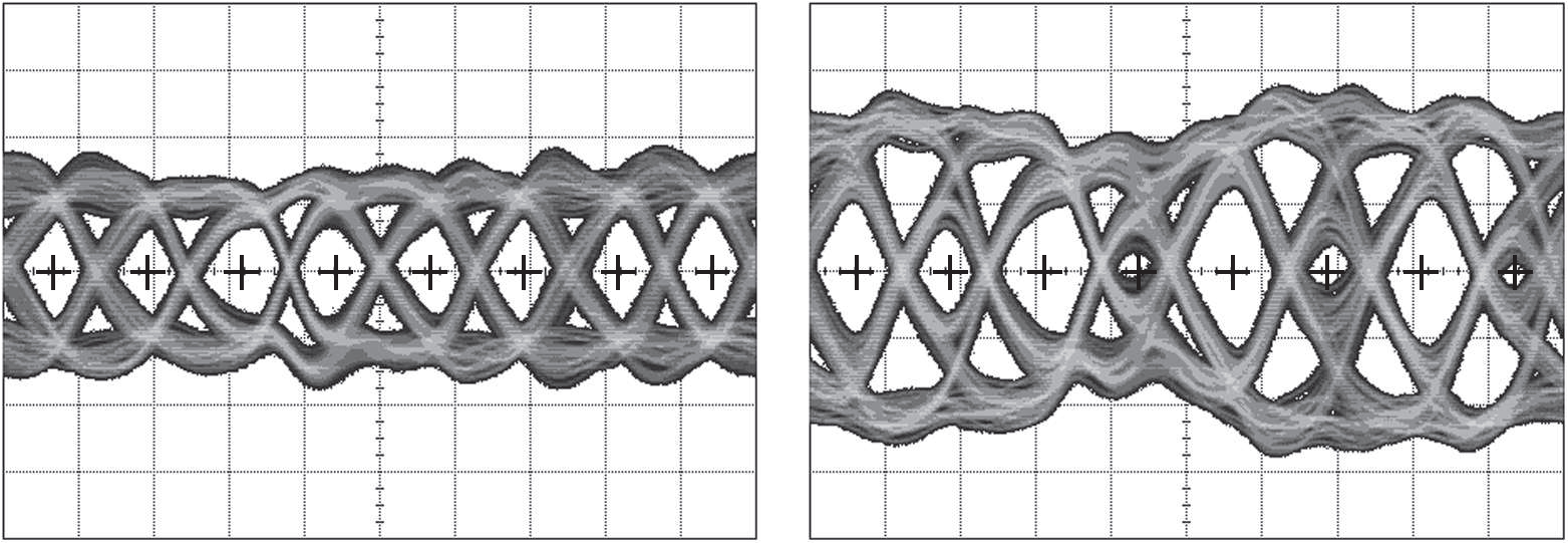 Рис. 14.33 «Глазковая диаграмма», получаемая наложением множества последовательных выборок одного сигнала, синхронизированных рабочим тактовым сигналом, который может быть как восстановленным из потока данных, так и переданным параллельно ему. Два экрана показывают сигнал на дальнем конце 60-сантиметрового полужёсткого коаксиального кабеля, по которому идёт псевдослучайный поток данных со скоростью 11.2 Gb/s (!). Слева : при передаче используется нормализация и диаграмма показывает правильную форму сигнала и хорошую равномерность моментов синхронизации ( отмечены символом «+» ). Справа : нормализация не используется. Картинка справа - хороший пример плохой глазковой диаграммы [* как сформулировано! ] По горизонтали 71.4 ps/div , по вертикали 125 mV/div , сигнал дифференциальный. Полоса пропускания осциллографа должна включать третью ( а лучше пятую ) гармонику наблюдаемого сигнала [* см. рис. A.5* ] , чтобы изображение на экране было пригодно для использования ( с разрешения Хэюн Чанг (Hayun Chung)