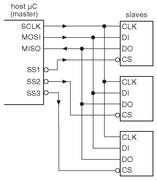 Рис. 14.38 Типичная шинная конфигурация SPI. Тактовый сигнал и линии данных общие, а входы выбора кристалла ( «SS'» ) индивидуальные