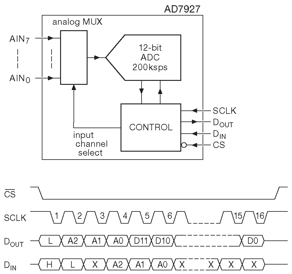 Возьмём, для примера, AD7927 - 12-разрядное АЦП умеренного быстродействия ( 200 ksps ) со встроенным мультиплексором на 8 входов и портом SPI ( рис. 14.39 ), через который выбирается требуемый канал и режим работы, а также считывается результат. Данная микросхема загружает первые 12 входных бит в регистр управления, отбрасывая все остальные, и одновременно возвращает 16-разрядное слово с результатом предыдущего преобразования ( рис. 14.39 ) 52 . Биты отсчитываются от нисходящего фронта на «SS'», который запускает преобразование. Некоторые примеры ИМС с интерфейсом SPI можно посмотреть на информационном плакате 15.21 .