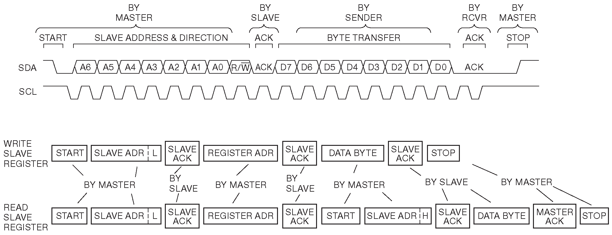 54 Данный процесс можно рассматривать как аналог передачи данных по шине PC104/ISA в приложении к последовательной шине. В PC104 ведущий выставляет адрес на линии «A19...A0», а направление обозначает стробами «IOW'/IOR'». При записи данные на «D7...D0» подаёт ведущий, а при чтении - выбранный ведомый. В I²C реализуется тот же набор действий, но в последовательной форме, причём и для адреса, и для данных используется одна линия «SDA», а каждый бит на ней сопровождается импульсом на линии «SCL». <-