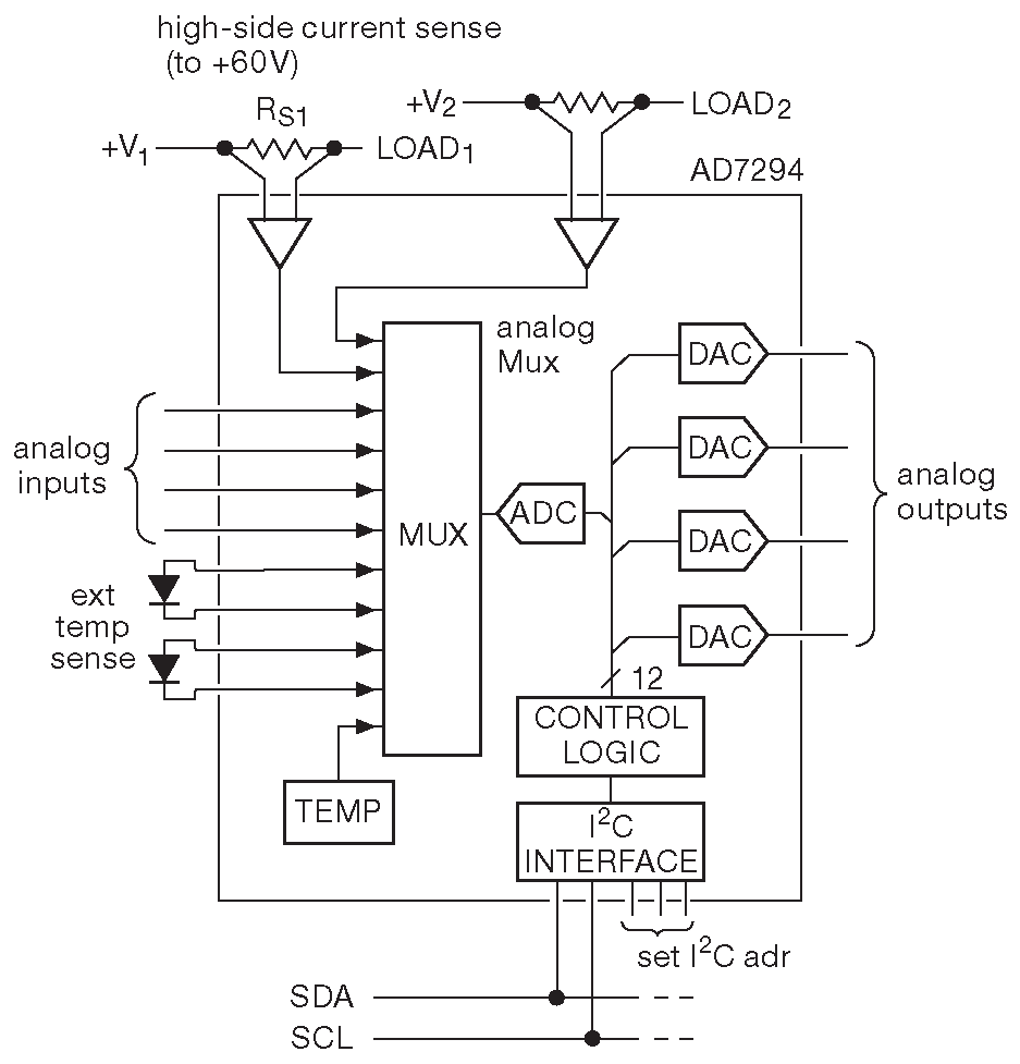 В качестве примера рассмотрим AD7294 - 12-разрядную «систему наблюдения в составе АЦП, ЦАПа, датчика температуры и измерителя тока». Это «швейцарский нож» для задач управления в автомобильной и промышленной электронике ( рис. 14.41 ). Не самый быстрый кристалл такого рода: АЦП выдаёт менее 300 ksps , но зато присматривает за всеми параметрами сразу, сообщая результат через шину I²C. Справочные данные объёмом 44 страницы сообщают, как организовать взаимодействие с внутренними регистрами, коих в ИМС 40 штук, и все с именами наподобие “AlertRegisterA(R/W)” или “DataHIGHRegisterTsenseINT(R/W)”. См. информационный плакат 15.22 с некоторыми примерами периферийных устройств с шиной I²C.