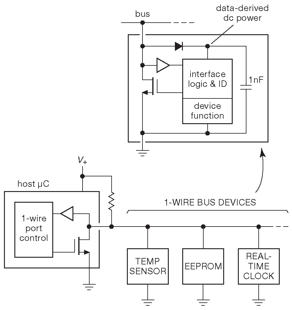 Рис. 14.42 Шина «1-wire™», предложенная фирмой Dallas-Maxim. Внутренний конденсатор позволяет ведомому не терять питание в момент прихода коротких импульсов данных