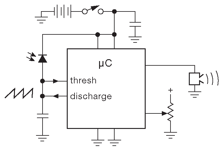 Классическое, но скучное, решение - преобразование тока в напряжение на резисторе обратной связи операционного усилителя, оцифровка выхода ОУ с помощью внутреннего АЦП с последующим интегрированием в цифровой форме. Но есть путь проще и лучше, вполне доступный микроконтроллеру ценой $0.50 ( рис. 15.2 ). Идея состоит в том, чтобы заряжать с помощью фототока конденсатор, затем, используя встроенный в µC компаратор, активировать короткий разрядный импульс через вывод порта, находящегося до того в третьем состоянии _5 . Такая схема генерирует пилообразный сигнал, чья частота пропорциональна освещённости. Микроконтроллер просто считает циклы заряд-разряд и включает сирену, когда нужный уровень достигнут ( устанавливается потенциометром «доза» ). Цифровой входной порт фиксирует нажатие на кнопку «START», а цифровой выходной порт управляет пьезо-зуммером.