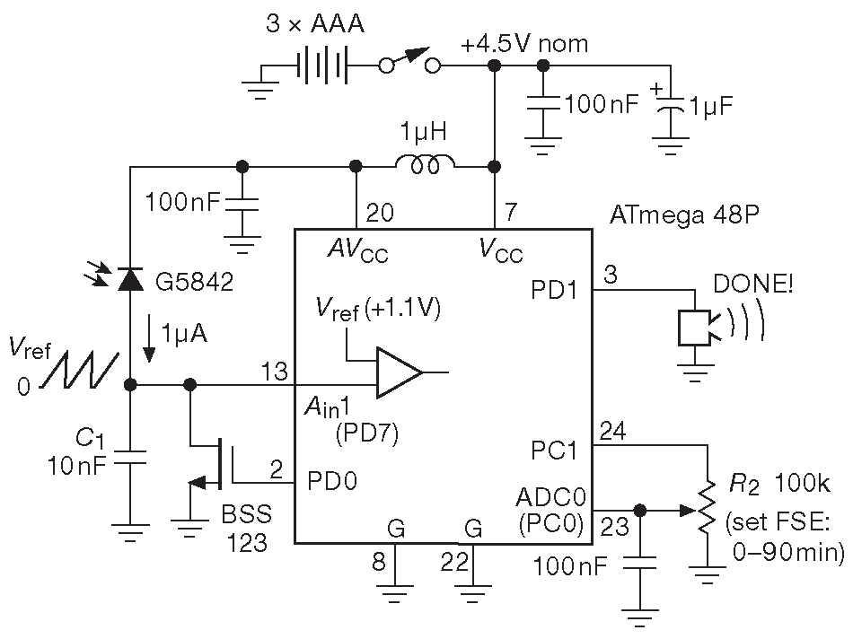 Читаем ( «Read “bake” setting» ) состояние потенциометра, задающего дозу. Для этого надо выдать на вывод «PC1» уровень Vcc , подождать 25 ms , запустить АЦП, подождать флага готовности данных, прочитать старший байт 10-разрядного результата ( в этой задаче точность лучше 0.5% не нужна ), снять питание с потенциометра и рассчитать требуемое число циклов интегратора. Последняя цифра предполагает нормальную пилу частотой 100 Hz с интегратора ( фототок 1 μA ) и полный цикл 90 минут.