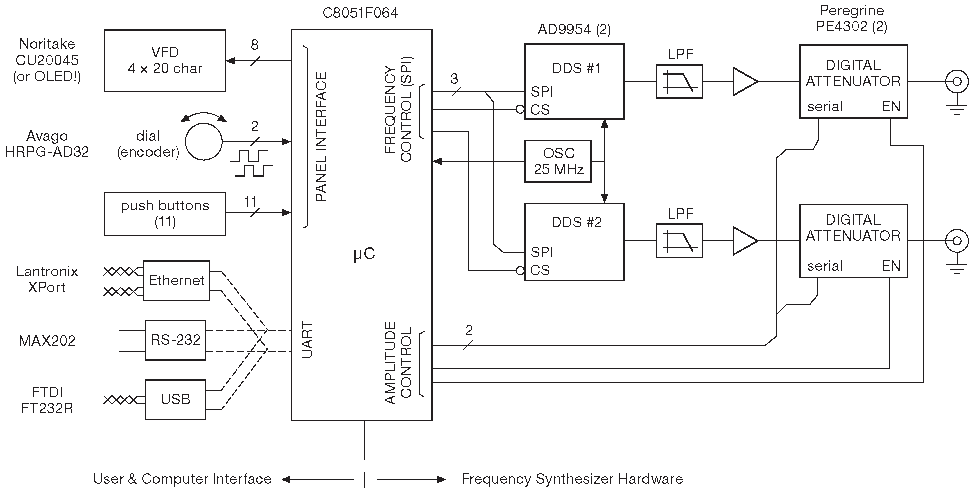 Со стороны пользователя стоят элементы для задания и подстройки параметров - кнопки и регулятор ( в качестве которого выступает «инкрементальный энкодер» ). Частота, амплитуда, фаза отображаются на вакуумном флуоресцентном дисплее ( VFD ) совместимом по разводке с ЖКИ аналогичного назначения. VFD дороже ЖКИ, но смотрится эффектнее. Дистанционное управление ведётся через последовательный порт контроллера, которому требуется только внешний преобразователь в уровни RS-232. Либо можно поставить внешнюю интерфейсную микросхему, типа FT232 для шины USB или XPort для Ethernet 23 .