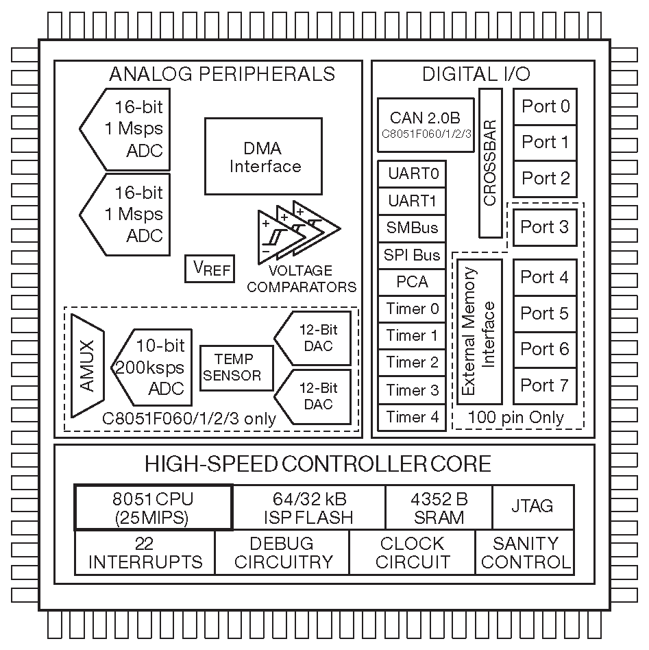 Рис. 15.7 Великолепный i8051 прошёл долгий путь от своего первого появления на публике в 1980 году, оброс дополнительными функциями и сократил длительность машинного цикла с 12 тактов у оригинальной разработки до 1 такта в моделях фирмы Silicon Labs. Иллюстрация взята из документации на C8051F060 ( интересно, что 328-страничный материал ничего не сообщает о назначении блока «SANITY CONTROL» )