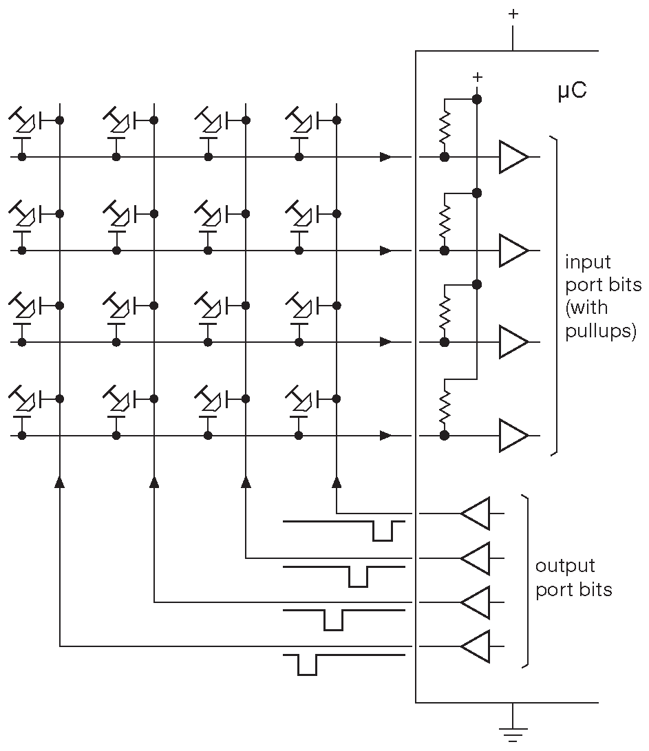 Рис. 15.8 Множество клавиш можно организовать в матрицу ( здесь 4×4 ). Такое включение сокращает число потребных линий ввода-вывода до \(N_{matrix}\)=r+c , где r - число рядов, а c - число колонок. При индивидуальном подключении кнопок понадобилось бы \(N_{indiv}\)=r×c линий