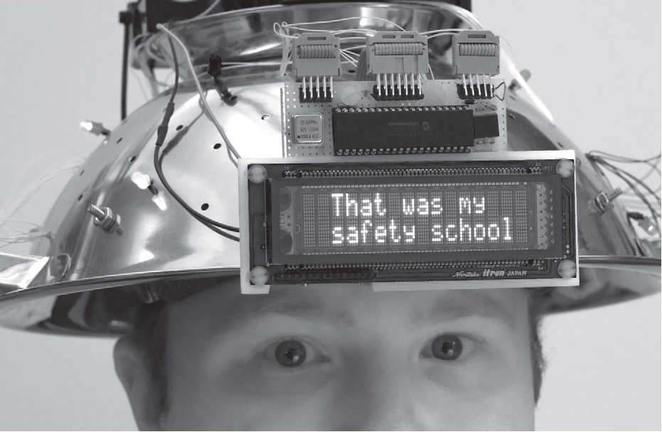 Трудно сказать, получилось ли у авторов объяснить, насколько микроконтроллеры увлекательная тема. На фото 15.25 показан электронный шлем Джейсона Галиччо (Jason Gallicchio) ко Дню всех святых 2004 года. По случайному стечению обстоятельств он больше напоминает электрифицированный дуршлаг, увешанный мигающими светодиодами и с пачкой батареек на макушке. Среди его примечательных возможностей есть и возможность чтения мыслей в голове, которую он прикрывает. На фото показана реакция транслятора после вопроса, «В какой колледж направляешься?»