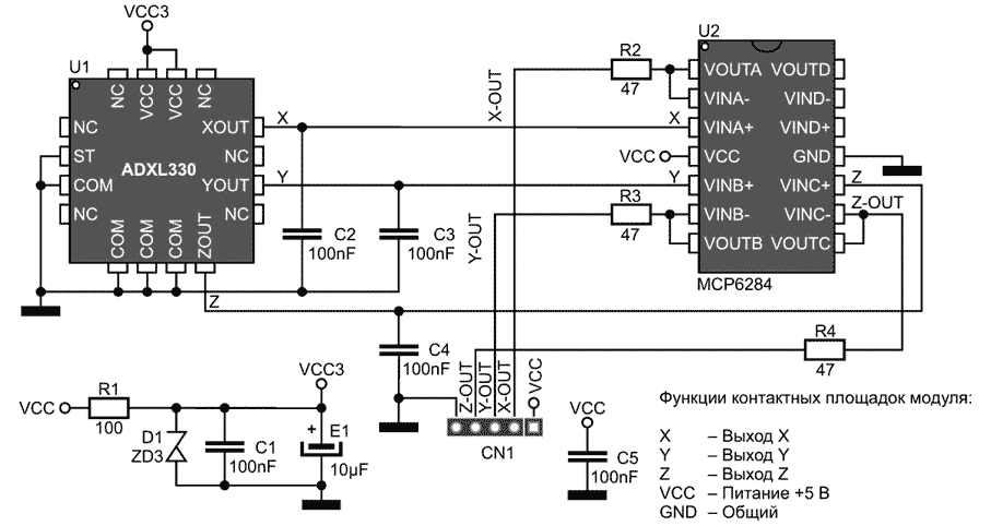 - Выводы питания операционных усилителей и логических схем подразумеваются и на схеме обычно не изображаются. Но любые нестандартные варианты (например, ОУ с одним питанием, где вывод «V-» подключён к земле) должны указываться явно. То же относится к неиспользуемым входам.