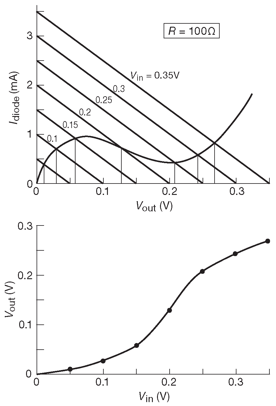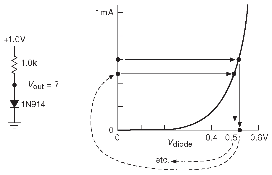 Одним из методов является примерная оценка тока, скажем, 0.6 mA . Затем по графику выясняется падение на диоде, а значит, и резисторе, по которым можно уточнить ток ( здесь 0.48 mA ). Такой последовательный метод показан на рис. F.1 . После нескольких циклов можно получить ответ, но процесс оставляет желать много лучшего.