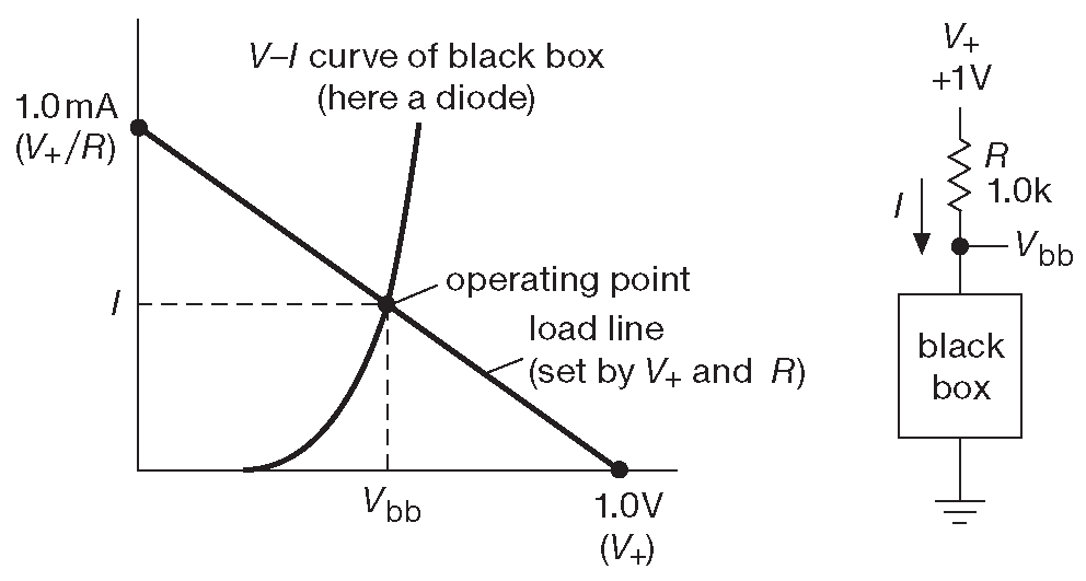 Метод нагрузочных линий позволяет получить ответ в такой задаче сразу. Предположим, в схеме F.1 вместо диода стоит какой-то прибор и 1.0 kΩ в качестве нагрузки. Построим график зависимости тока резистора от напряжения на двухвыводном приборе. Это легко. При падении на приборе 0V ток равен \( V_+/R\) ( всё напряжение падает на резисторе ). При падении на приборе \( V_+\) , ток через резистор отсутствует. Промежуточные значения попадают на прямую между этими двумя точками [* поэтому что резистор - линейный элемент ] . Теперь на том же графике надо нарисовать вольтамперную характеристику второго элемента. Рабочая точка принадлежит обоим графикам, т.е. лежит в точках их пересечения ( рис. F.2 ).
