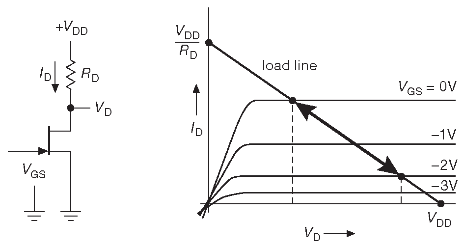 Нагрузочные линии можно использовать и для трёхвыводных устройств, например, электронных ламп или транзисторов, надо только нарисовать семейство кривых для этих приборов. Рис. F.3 показывает, как это будет выглядеть для обеднённого полевого транзистора с графиками для разных напряжений затвор-исток. Получить выходные параметры можно, двигаясь вдоль нагрузочной линии, ограниченной кривыми, соответствующими входному сигналу и считывая нужные значения на осях. В данном примере показана картина для входного сигнала между 0V и –2V .