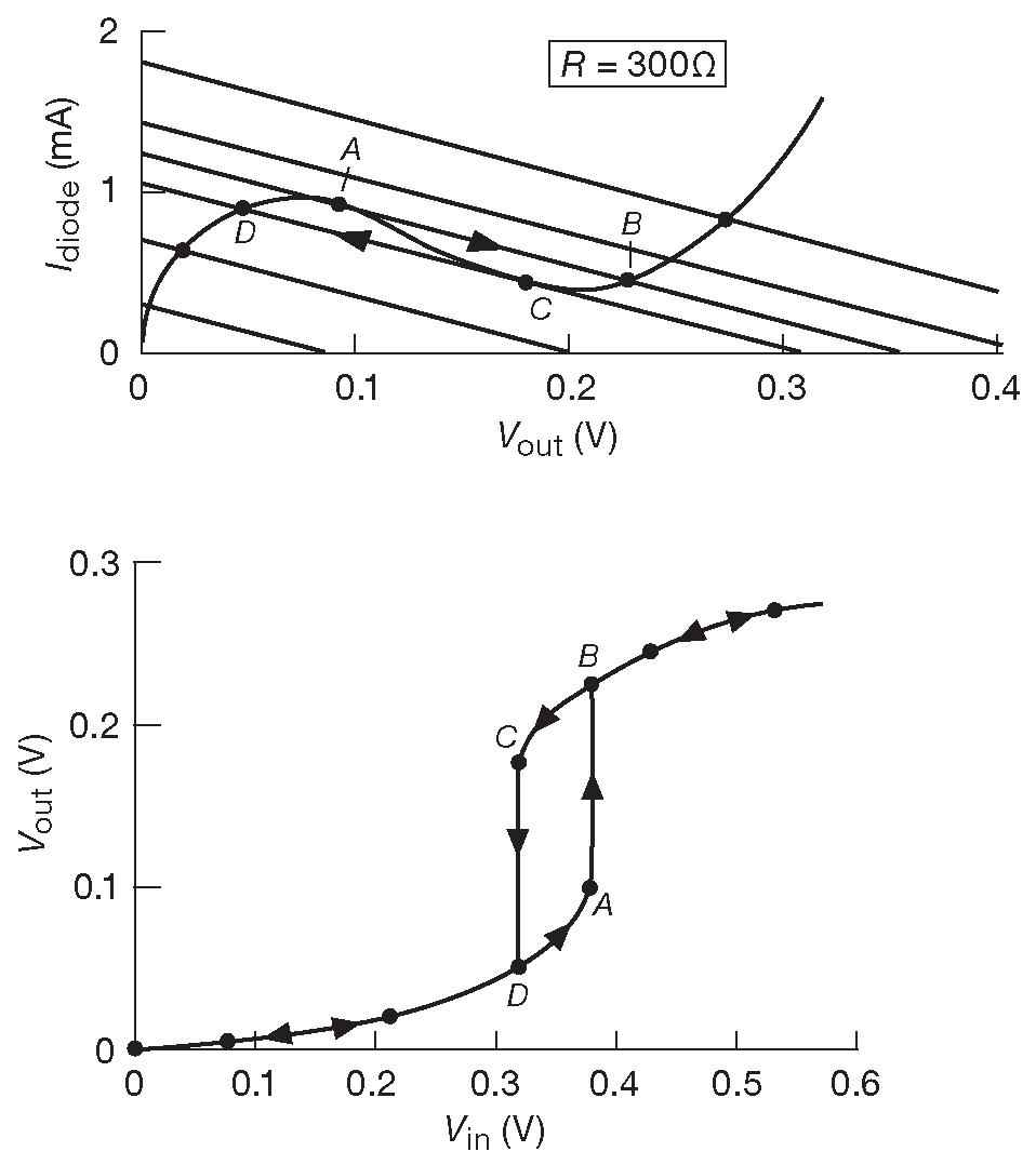 Самое интересное происходит, если нагрузочные линии идут положе, чем центральная секция вольтамперной характеристики диода. Это случается, когда нагрузочное сопротивление превышает размах отрицательного сопротивления диода. В этом случае появляется две точки пересечения графиков ( рис. F.6 ). Возрастающий сигнал на входе следует вдоль нагрузочной линии до первой точки пересечения, непонятно куда исчезает и вновь появляется, когда сигнал достигает второй точки \( V_{out}\) . В обратном направлении напряжение идёт до верхней точки пересечения и проваливается до второй точки, где возникает вновь. На графике функции передачи появляется область гистерезиса . Туннельные диоды использовались в качестве быстрых переключательных устройств ( триггеров ).