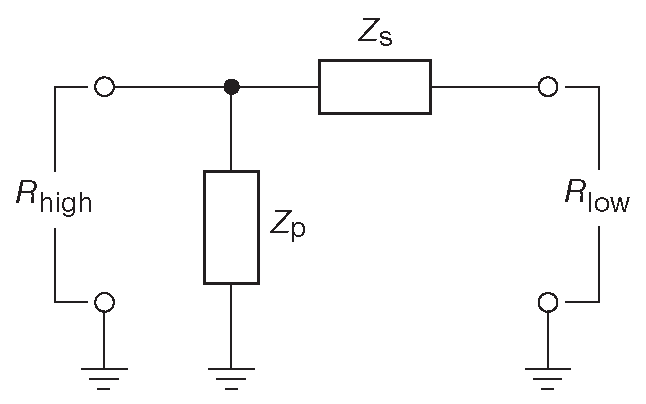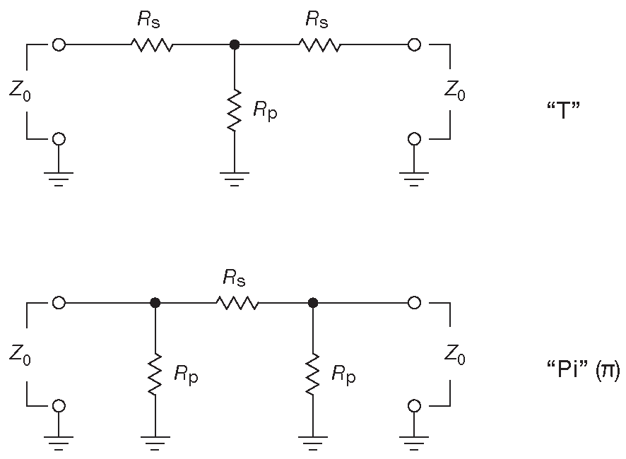 Решением проблемы служит резистивный аттенюатор с согласованием импедансов. Есть две топологии «T-» и «π-», названные по схемному представлению ( рис. H.12 ). Величины резисторов считаются по формулам: