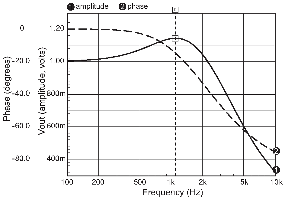 Рис. J.2 Программный «осциллограф» показывает усиление и фазу ( «AC Analysis» ) схемы J.1 . Курсором отмечено пиковое значение усиления Vout/Vin = 1.142 на частоте 1.096 kHz . Текст увеличен для улучшения читаемости