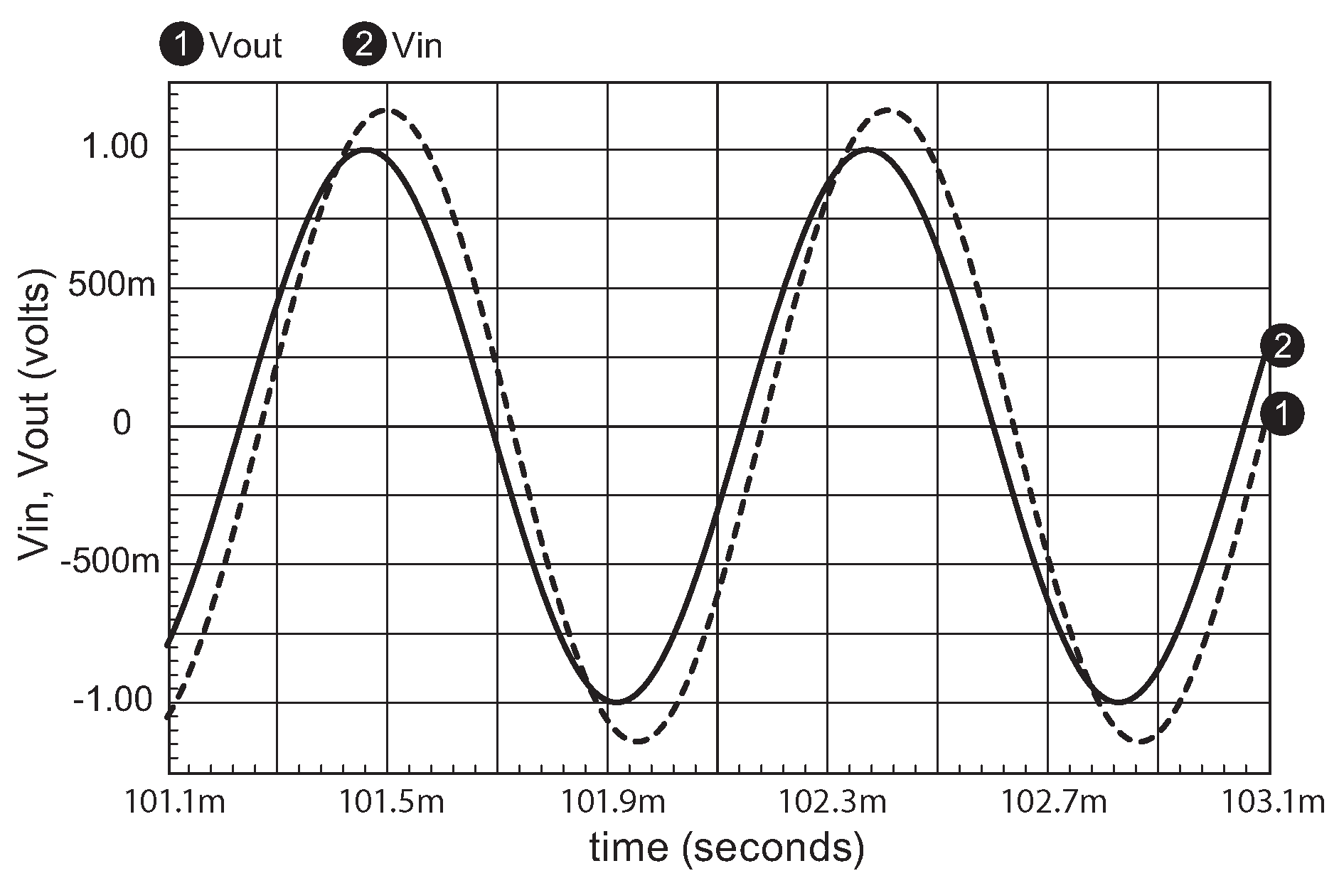 Рис. J.3 Картинка с «осциллографа» для RC цепочки с рис. J.1 показывает синусоидальный выход ( «Transient Analysis» ) на частоте максимального усиления. Масштаб осей подогнан для имитации настоящего прибора