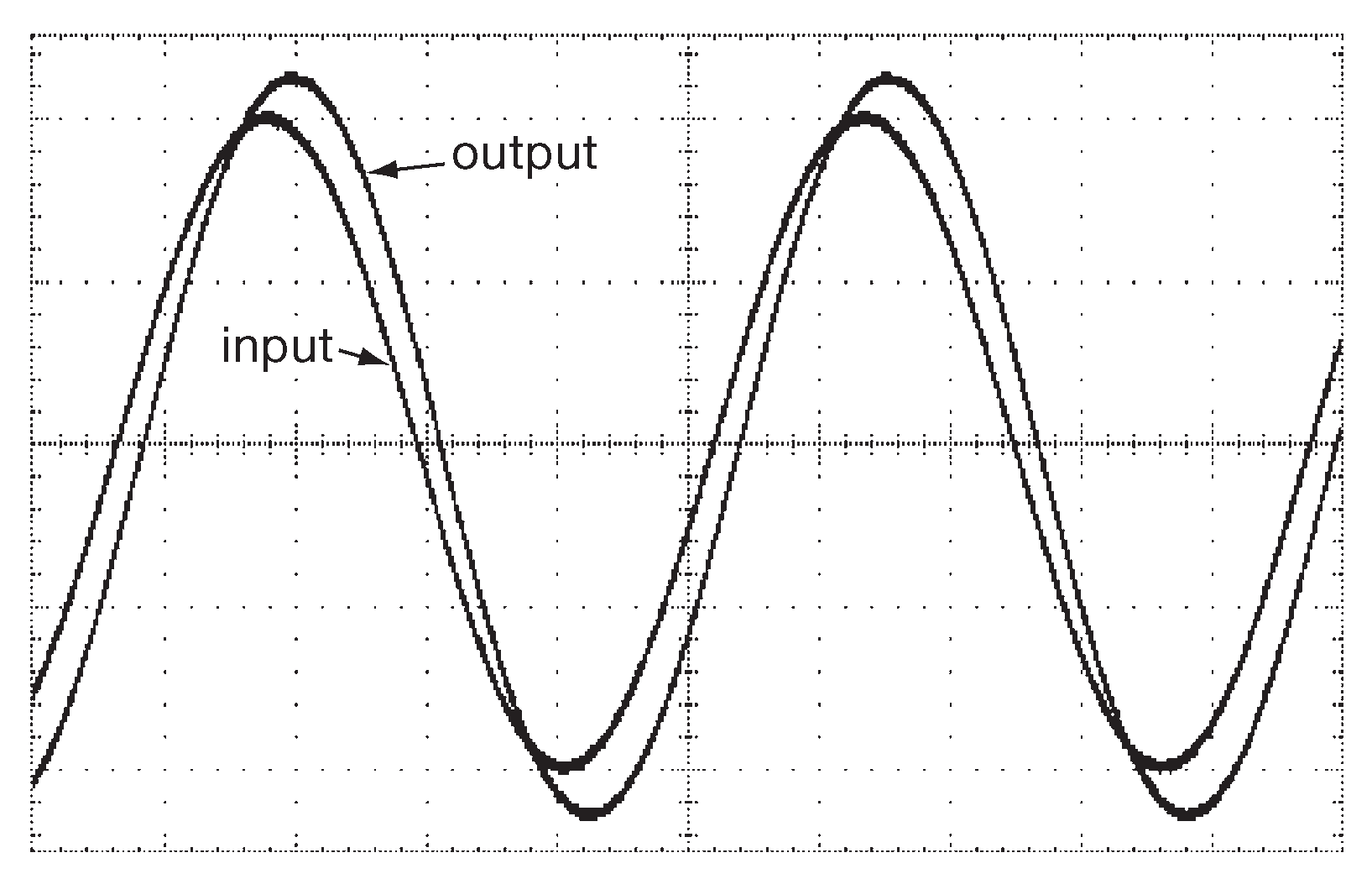 Результат смотрится неплохо, но сигнал немного грубоват. Если увеличить разрешение ( окно «Scaling» ), то станет видно, что рисунок имеет только 20 точек на период. В настройках запрашивался интервал 1 μs , а на выходе имеем 50 μs . Это произошло из-за того, что не задана граница максимального шага времени ( «Maximum Time Step» ) в окне «Transient Analysis». Надо вернуться к настройкам ( «Simulation Setup → Transient» ), установить «Maximum Time Step» на 1us и запустить моделирование. Дело пойдёт чуть медленнее, возможно займёт целую секунду. Дальше надо стереть старый график и добавить два новых сигнала в «IntuScope» ( сначала выход, чтобы задать правильный масштаб, затем вход ). Теперь картинка гладкая и красивая ( рис. J.3 ). Если сомнения всё ещё остаются, то можно проверить усиление схемы по картинке с настоящего осциллографа ( рис. J.4 ). Усиление по напряжению в RC цепи вполне реально!