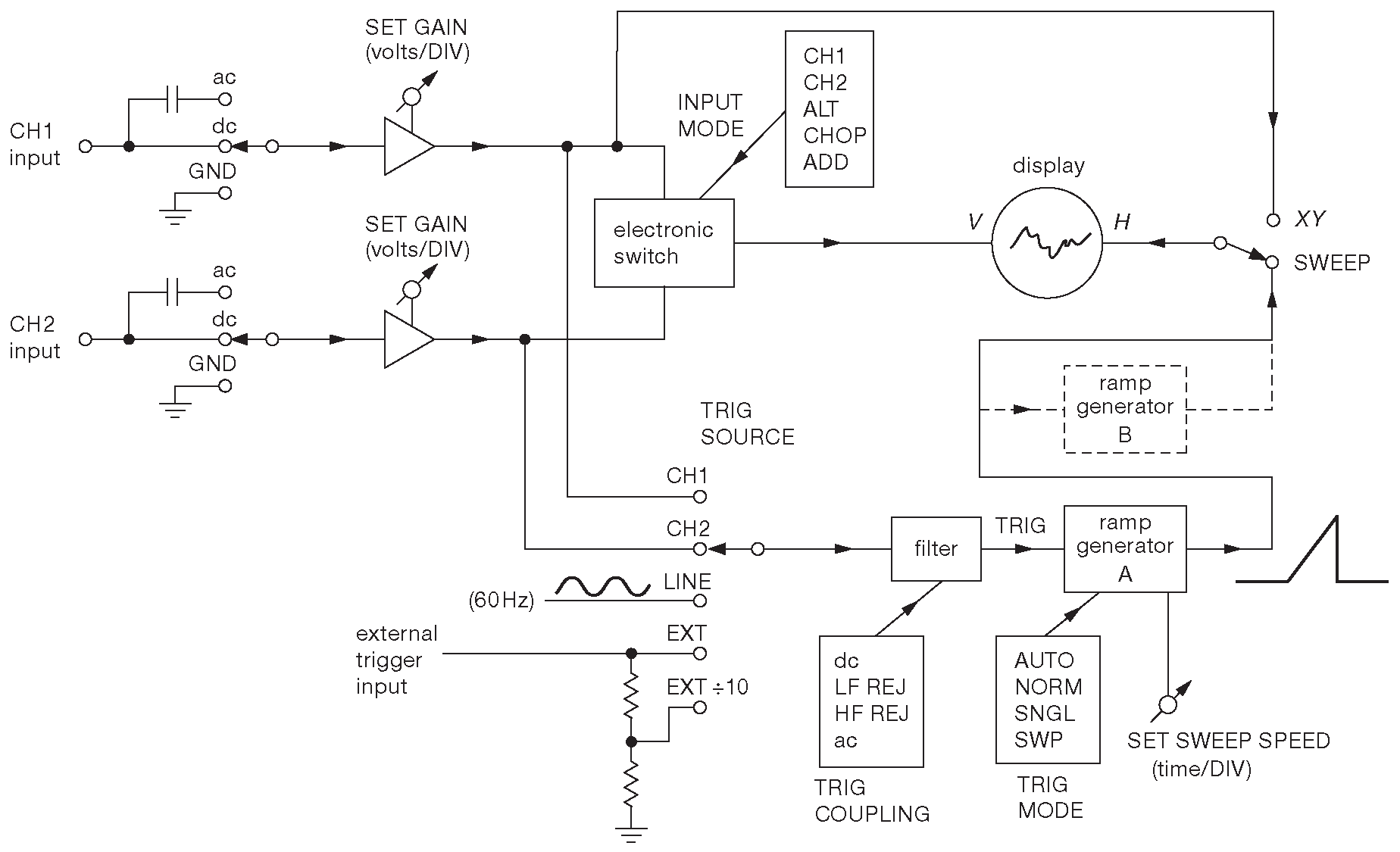 Рис. O.1 Блок-схема 2-канального аналогового осциллографа