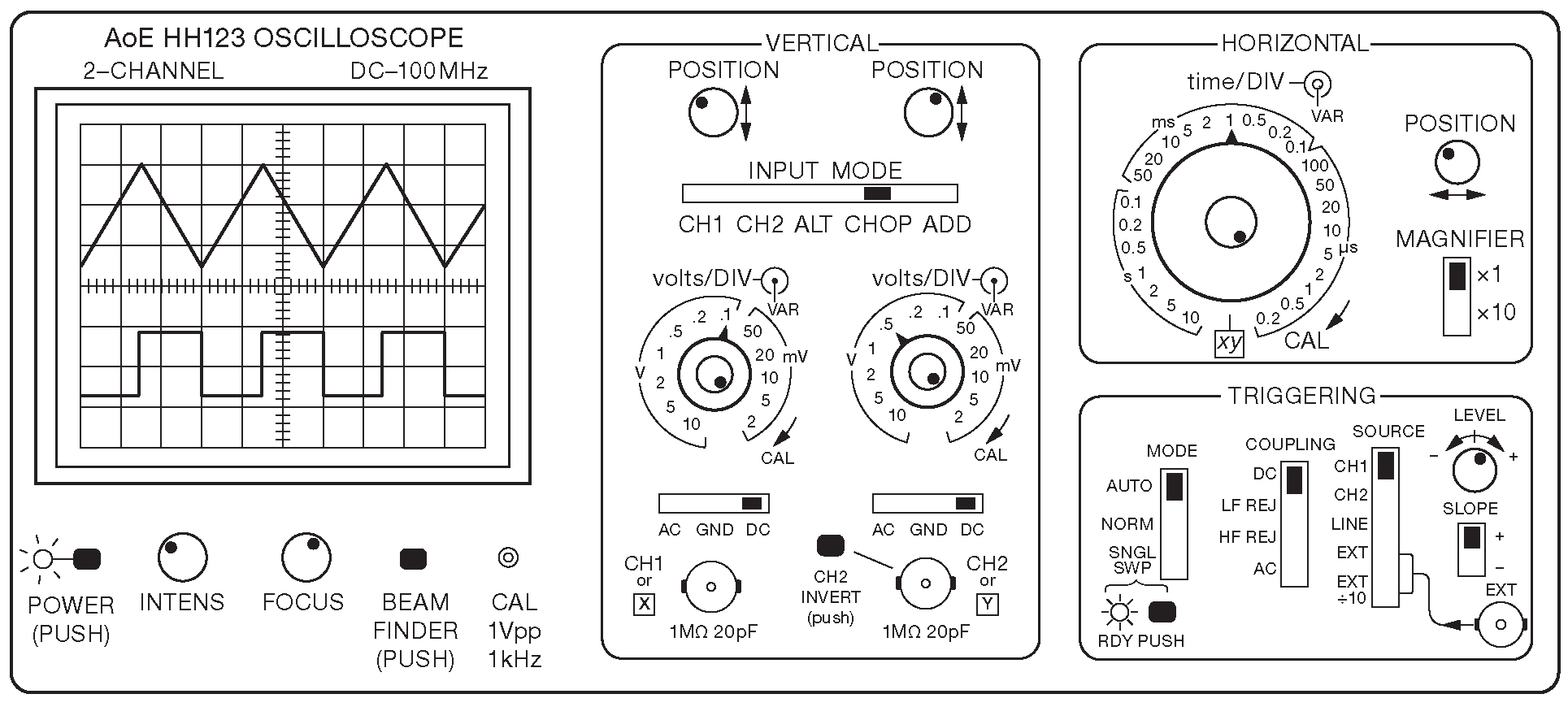 Начнём с сигнальных входов. Большая часть аналоговых осциллографов имеет два канала, что очень удобно, потому что часто требуется рассматривать зависимость между двумя сигналами. Каждый канал имеет переключатель усиления ( «volts/DIV» ) с калиброванными коэффициентами. Им задаётся вертикальный масштаб для изображения _2 . Есть также ручка плавного изменения вертикальной шкалы ( ручка соосна переключателю ), если требуется подогнать картинку под заданный вертикальный размер.