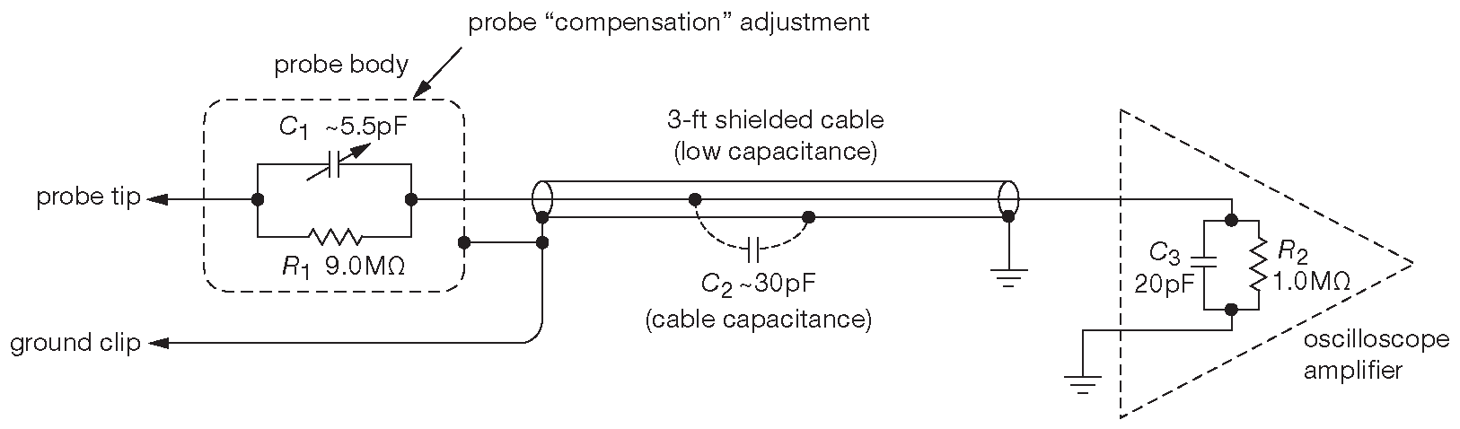Рис. O.3 Пассивный осциллографический пробник «10×» ослабляет сигнал в десять раз на всех частотах, но поднимает входной импеданс в той же пропорции. В практических конструкциях используются разнообразные приёмы, подавляющие эффекты длинных линий ( см. текст )