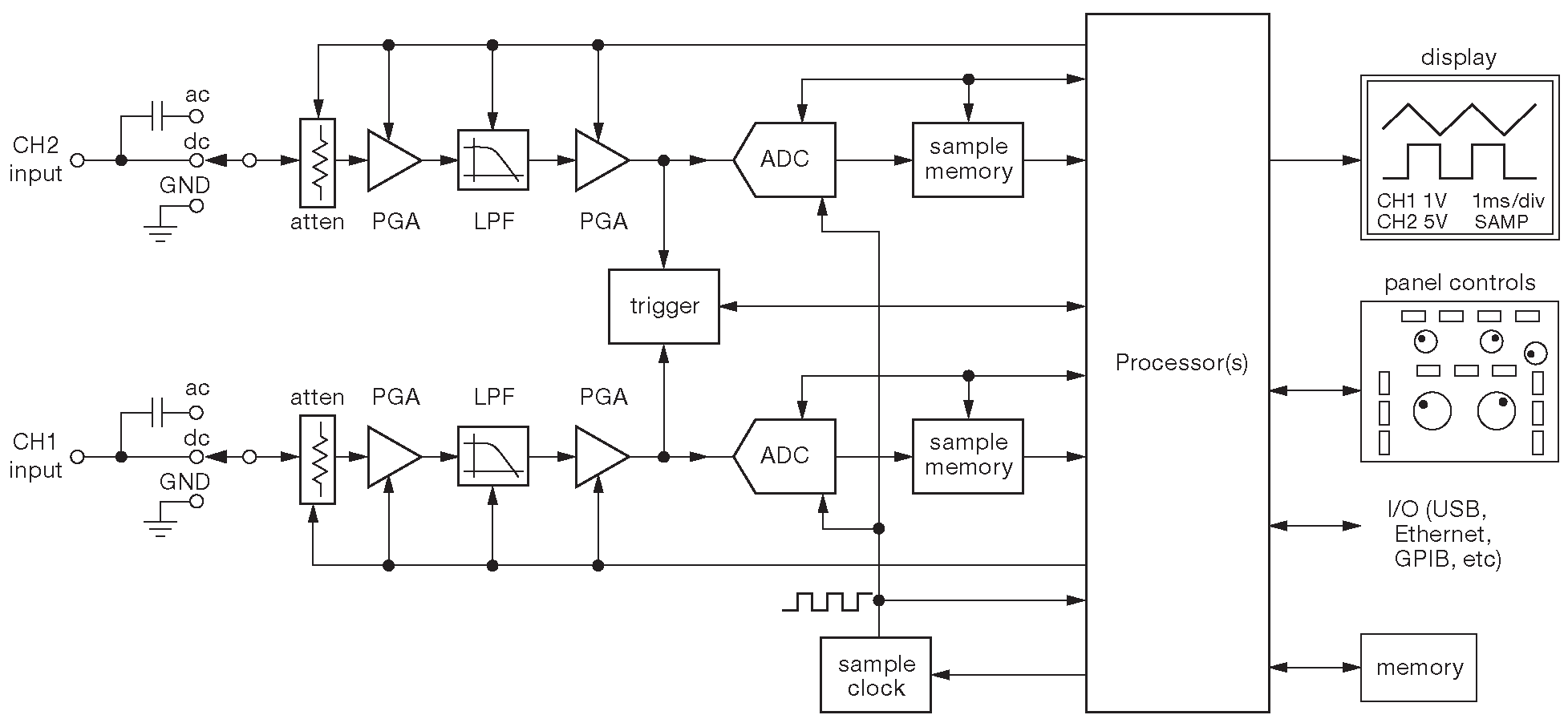 Рис. O.4 Блок-схема 2-канального цифрового осциллографа