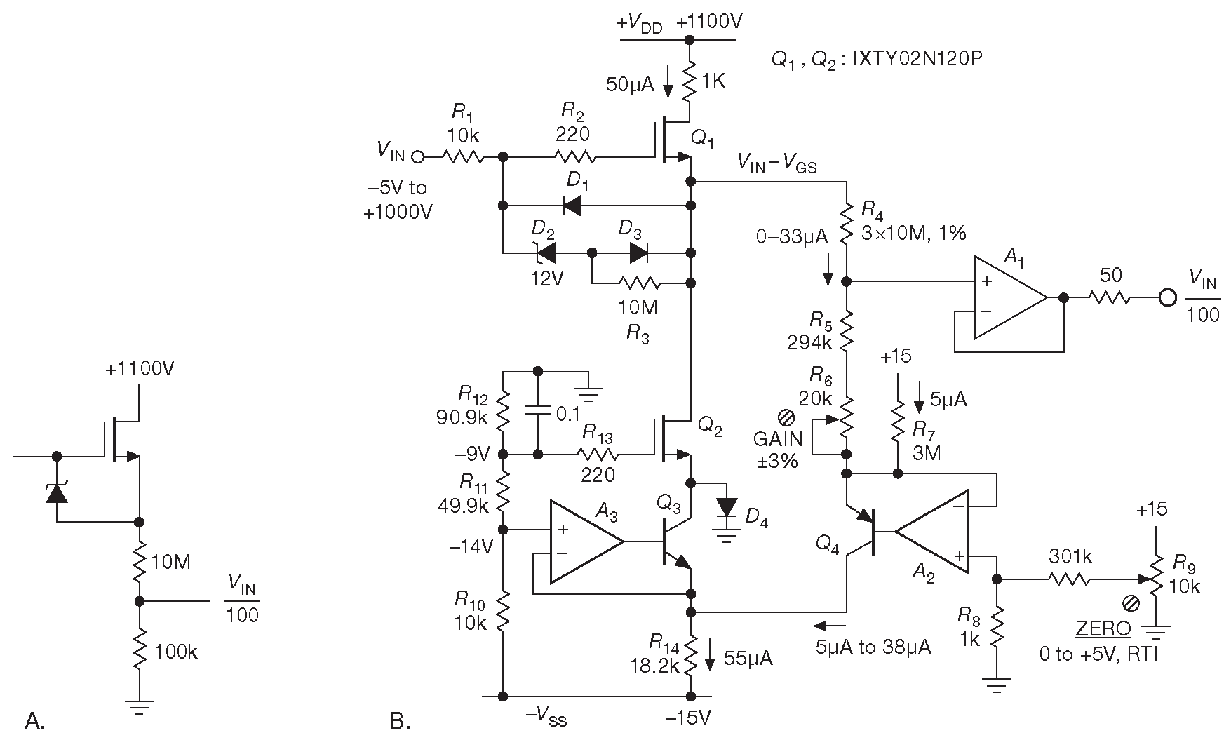 Общий принцип показан на рис. X3.76A . Это просто высоковольтный повторитель с выходным делителем 100:1 . Подход рабочий, но не без серьёзных недостатков, самый очевидный из которых - нулевое выходное напряжение для входных потенциалов ниже действующего \( V_{th}\) . Иначе говоря, схема имеет нескомпенсированную ошибку, вызванную напряжением \( V_{GS}\) . Вдобавок его величина меняется при изменении тока стока от максимума ( здесь 100 μA при 1 kV ) до минимума ( менее микроампера при 10 V на входе ).