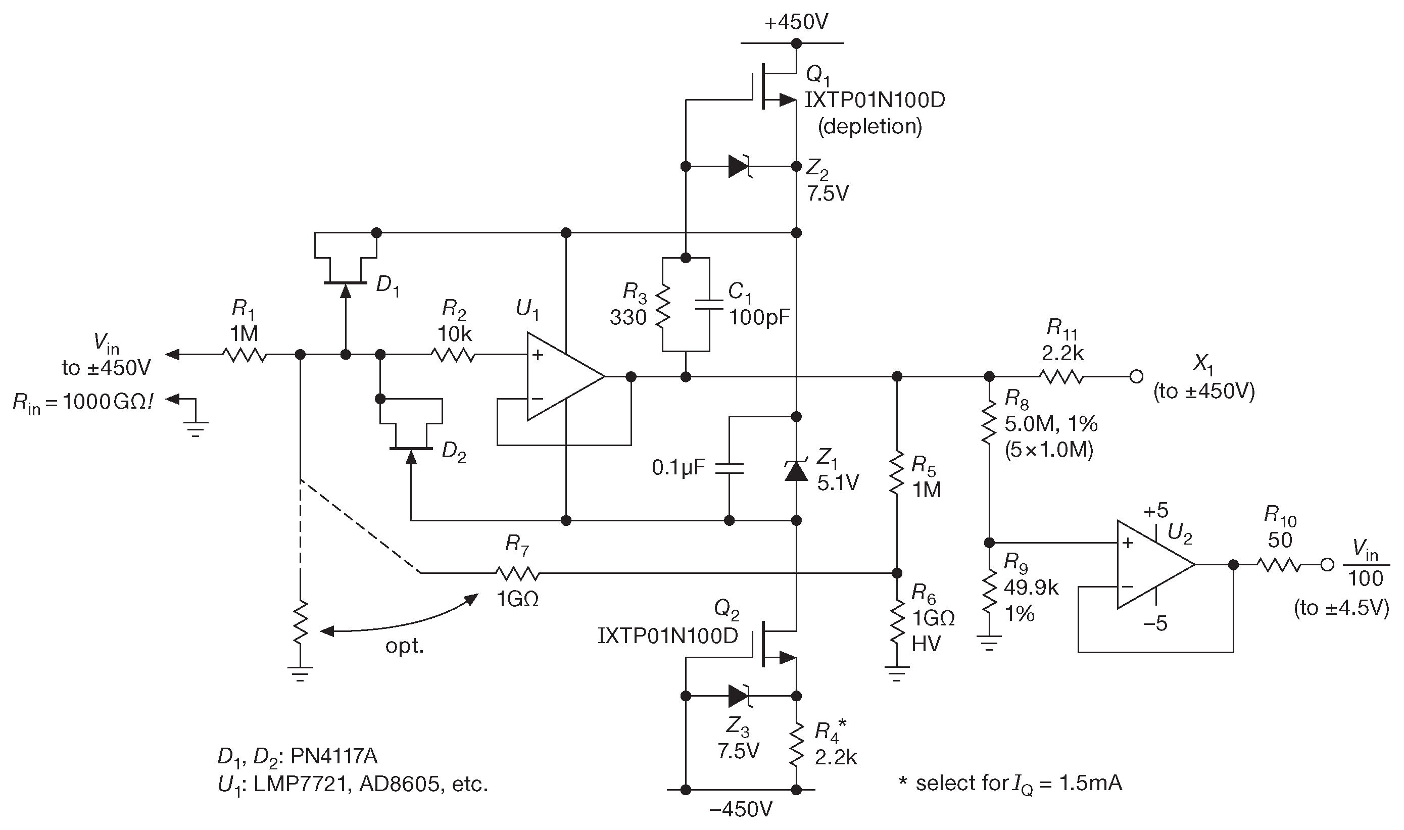 Постановка задачи. Требуется измерять напряжения в высоковольтных схемах, когда нагрузка от щупа с сопротивлением 10 и даже 100 MΩ недопустима. Решение: познакомьтесь со схемой, которая допускает высокие входные напряжения, имеет входной ток менее микроампера ( а, скорее всего, в пикоамперном диапазоне ) и выдаёт мониторный сигнал \( V_{in}\) /100 . Для такой задачи хорошо подходят высоковольтные МОП транзисторы. Здесь разбираются два подхода к решению.