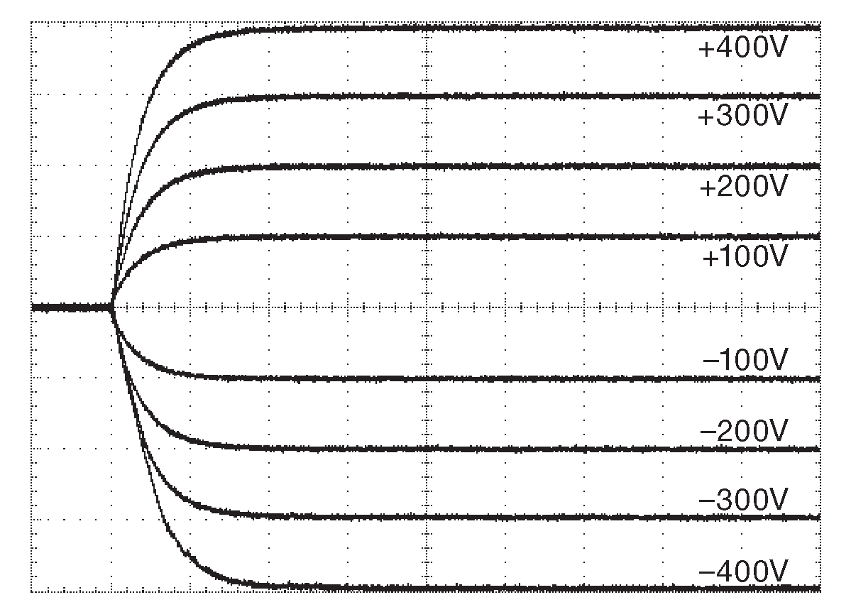 Была предпринята попытка сжечь прототип, проведя тест с резким переключением ±400 V . Чтобы получить самый короткий фронт, было задействовано ртутное реле, которое быстро переключало вход между жёстким положительным и отрицательным напряжением ( от 0 до ±400 V ). На рис. X3.78 показаны некоторые результаты для входного скачка. Тест был с треском провален: спалить схему не удалось.