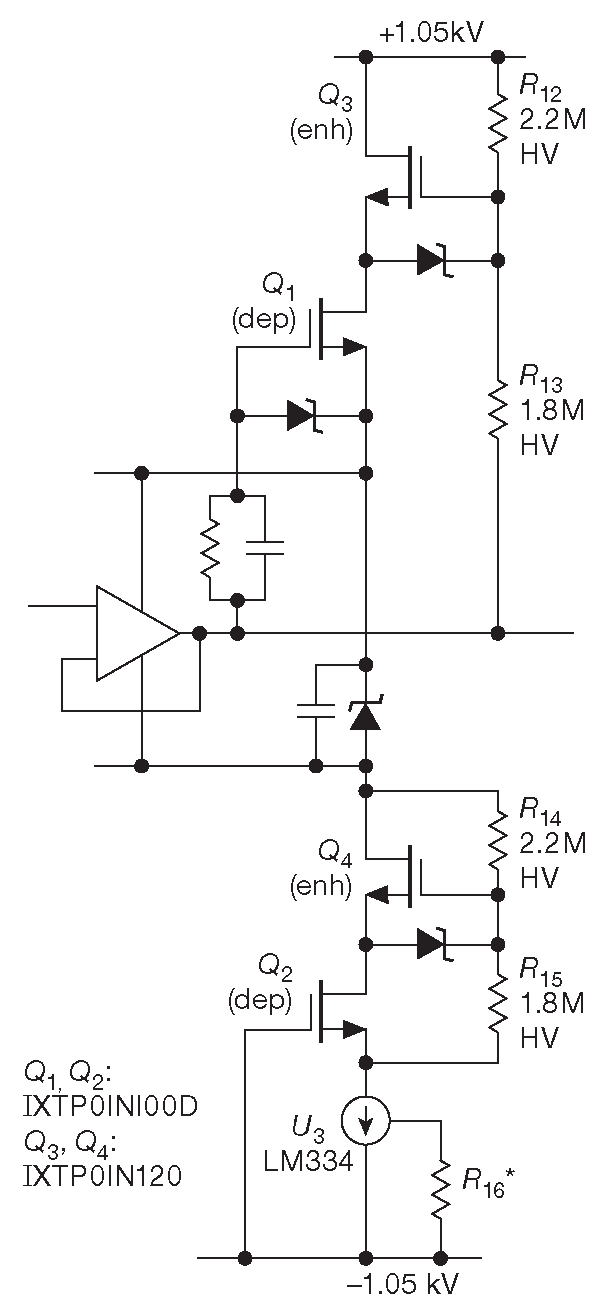 На схеме X3.79 показано, как это делается. \(Q_1\) работает, как и прежде, обеспечивая положительное питание для операционного усилителя, но уже с сигналами ±1 kV . Делитель \(R_{12}R_{13}\) распределяет напряжение «+HV» между \(Q_1\) и \(Q_3\) , работающим в режиме обогащения [* нормально закрытый в каскодном включении ] . На шине «–HV» работает такая же пара \(Q_2Q_4\) , но схема источника тока иная. Вместо малопредсказуемого автоматического смещения \(Q_2R_4\) ( рис. X3.77 ) используется программируемый 2-выводной источник тока LM334 ( \(U_3\) ). Он задаёт нужную величину, а \(Q_2\) работает каскодом ( см. ##§X3.6.4 ). Схему можно и дальше менять таким же способом. Можно добавить по транзистору поверх \(Q_3\) и \(Q_4\) , можно заменить сами \(Q_3\) и \(Q_4\) на более высоковольтные, а можно использовать оба способа одновременно.