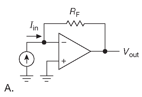 В этой главе разбираются усилители напряжения, управляемые током, или трансрезистивные усилители, знакомство с которыми произошло в §4.3.1.C . Это операционный усилитель с резистором обратной связи \(R_f\) (рис. X4.16A ), который преобразует входной ток \(I_{in}\) , текущий через суммирующую точку, в выходное напряжение \(V_{out}=-R_fZ_{in}\) . Название «трансрезистивный» определяется размерностью усиления ( выход/вход ), которое равно G = \(V_{out}/I_{in}=R_f\) и совпадает по размерности с сопротивлением. Часто встречается термин «трансимпедансный» или TIA . Он учитывает обобщённую форму цепи обратной связи, которая может вносить сдвиг фаз, но обычно подобные усилители используются в качестве простых преобразователей ток-напряжение, поэтому в тексте будут встречаться все варианты названия.