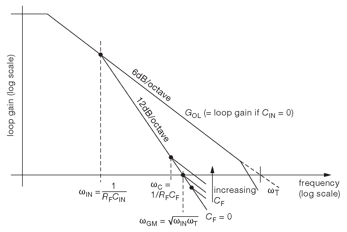 - Обратите внимание, что в общем случае можно считать, что ОУ ведёт себя подобно классическому усилителю с наклоном АЧХ 6 dB/octave и задержкой фазы 90° , иначе говоря, «модель с единственным главным полюсом», если использовать инженерную нотацию. Здесь не нужно заботиться о дополнительном сдвиге фаз, который обычно начинает увеличиваться по мере приближения к \(f_T\) ОУ. Происходит это благодаря большому резистору обратной связи, который сдвигает входной полюс характеристики \(f_{RCin}\) слишком далеко вниз по частоте. В результате наиболее неприятная область \(f_{GM}=\sqrt{f_{RCin}f_T}\) оказывается существенно ниже частот, где поведение усилителя начинает заметно отклоняться от простой однополюсной модели.