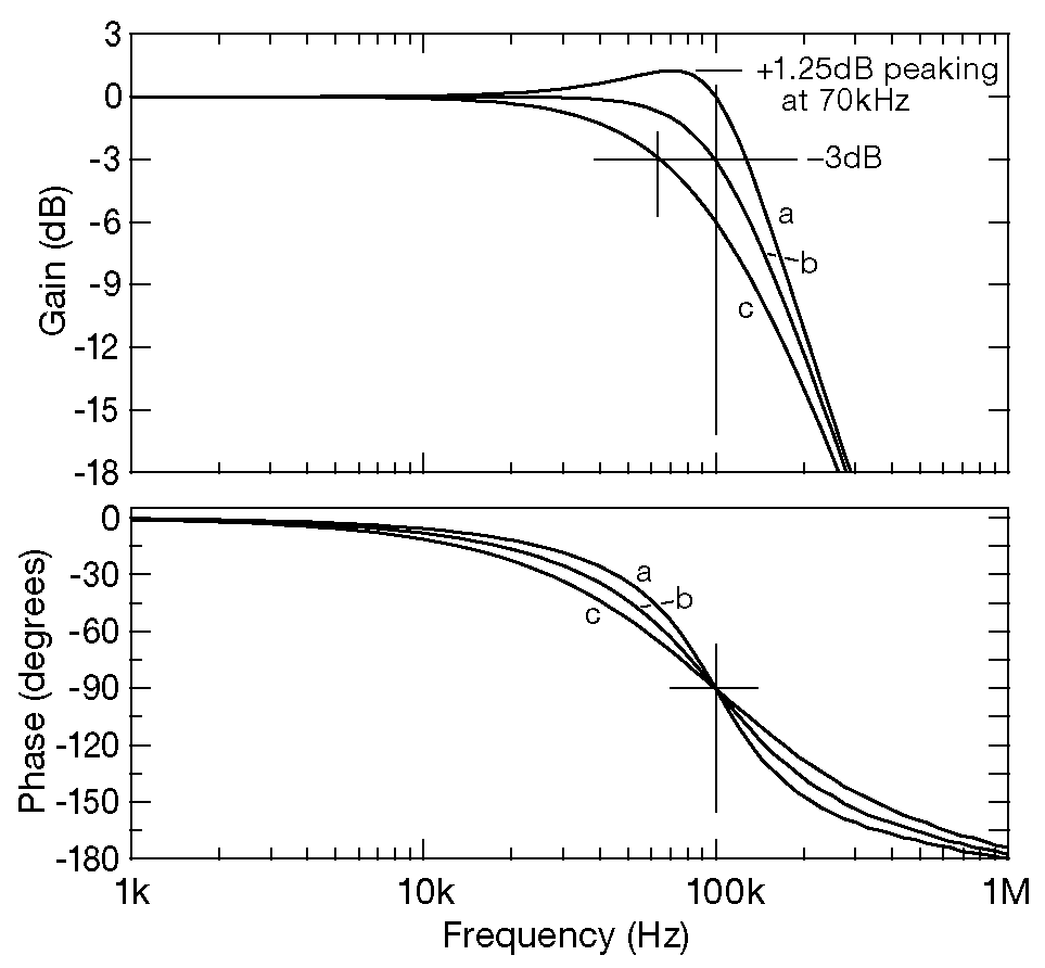 Рис. X4.20 АЧХ и ФЧХ TIA (нормализованное трансрезистивное усиление и фаза по частоте) для трёх номиналов \(C_f\) , выбираемых из соотношения \(f_c\) = 0.7\(f_{GM}\)/ζ , где коэффициент демпфирования составляет: (a) ζ = 0.7 - недостаточное демпфирование, (b) ζ = 1.0 - критическое демпфирование и (c) ζ = 1.4 - избыточное демпфирование. Моделирование в SPICE показало полосу трансрезистивного усилителя 100 kHz . Снижение коэффициента передачи на высоких частотах определяется спадом 12 dB/octave в ОУ