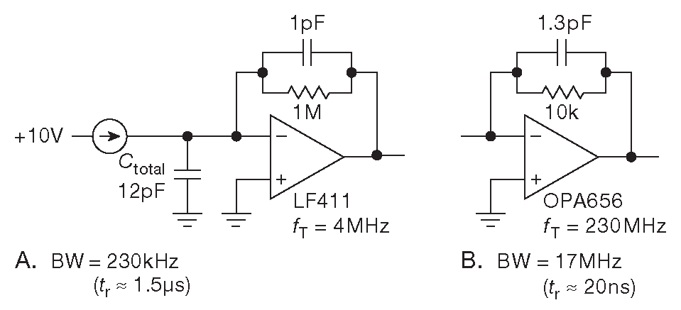 Рис. X4.22 Пример усилителя для фотодиода. (A) На обычном LF411 ( \(f_T\) = 4 MHz ), с G = 1 V/μA . (B) На широкополосном OPA656 ( \(f_T\) = 230 MHz ), G = 10 mV/μA