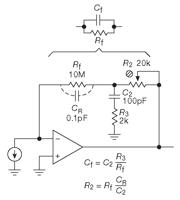 Что делать, если расчётная ёмкость обратной связи получилась меньше паразитной? Одним из решений будет снижение номинала резистора обратной связи до уровня, при котором паразитная ёмкость будет примерно равна расчётной. Снизившееся в результате такого действия трансрезистивное усиление придётся компенсировать дополнительным каскадом 14 . Ещё одно решение показано на рис. X4.23 . Неустранимая постоянная времени \(R_fC_R\) резистора обратной связи и его собственной паразитной ёмкости \(C_R\) ( «нуль» ) целенаправленно компенсируется задержкой \(R_2C_2\) ( «полюс» ), а дополнительный резистор \(R_3\) образует ещё одну постоянную времени \(R_3C_2\) - ещё один нуль. Например, если для конкретной схемы требуется \(C_f\) = 0.02 pF параллельно резистору 10 MΩ , то возникает проблема из-за слишком большой паразитной ёмкости \(C_R\) = 0.1 pF . Ситуация выравнивается резистором \(R_2\) = 10 kΩ , \(C_2\) = 100 pF и дополнительным \(R_3\) = 2 kΩ ( рис. X4.23 ) 15 . Авторы не встречали в литературе описания данного приёма, но вполне успешно использовали его в нескольких широкополосных усилителях для фотодиодов.