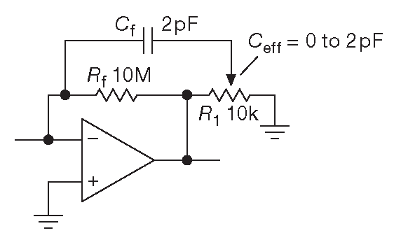 Рис. X4.24 Получение «подстраиваемого» конденсатора обратной связи. Общая действующая ёмкость обратной связи включает паразитную ёмкость резистора \(R_f\) величиной ∼0.1 pF ( не показана )