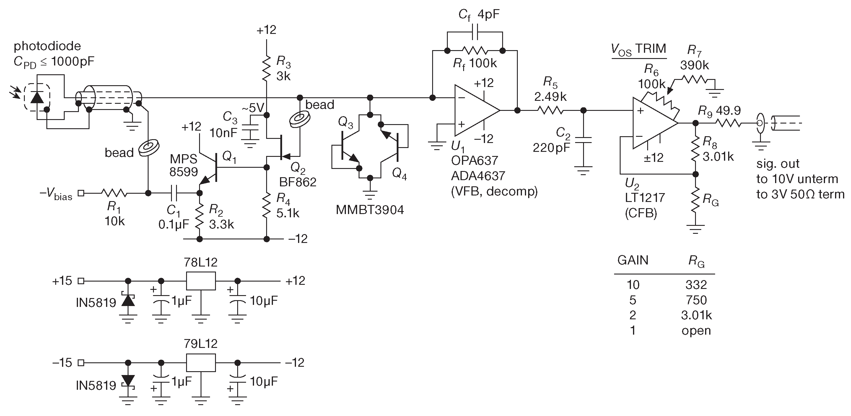 Схема на рис. X4.25 поможет собрать всё сказанное воедино 16 . Это базовая схема RIS-617 - усилителя для фотодиодов, активно используемого в исследованиях Rowland Institute. Для трансимпедансного звена выбран ОУ с полевыми транзисторами на входе OPA637 ( или эквивалент ADA4637 ) за сочетание низкого входного тока, низкого шумового напряжения ( \(e_n\) = 4.5 nV/\(\sqrt{Hz}\) ) и широкой полосы ( \(f_T\) = 80 MHz ). Это недокорректированная версия ( G > 5 ) устойчивого с единичным усилением OPA627 ( но его полоса \(f_T\) = 16 MHz ). OPA637 хорошо подходит для трансимпедансных схем, подобных этой, потому что допускает агрессивную коррекцию внешним конденсатором \(C_f\) , а широкая рабочая полоса благотворно сказывается на скорости итоговой схемы.