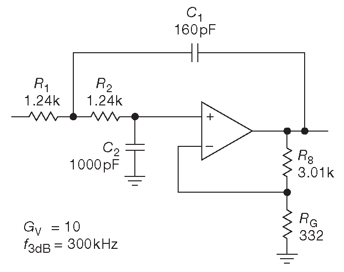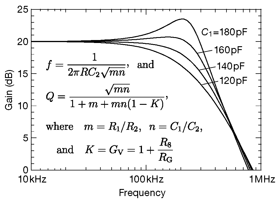 20 Это модифицированная схема VCVS фильтра ( рис. 6.28A ), для которого выбрано G = 10 , \(R_1=R_2\) , а конденсаторы подбираются под гладкий переход ( с низким значением Q ) к наклону –12 dB/octave . Иначе говоря, здесь нарушается правило расчёта VCVS фильтров Баттерворта: для усиления G = 10 выбираются \(C_1\) и \(C_2\) из соотношения 0.4× и 2.5× к каноническому значению \(C=1/(2πRf_c)\) . Эти обобщённые фильтры Саллена-Ки обсуждаются в §6.3.2.D . <-