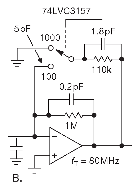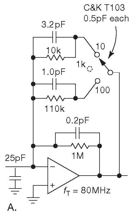 Рис. X4.29 показывает два подхода к решению. Оба используют один ОУ ( \(f_T\) = 80 MHz ) и предполагают, что входная ёмкость составляет 25 pF . Требуется получить полосу 500 kHz с усилением 1 MΩ . В схеме X4.29A используется обычный переключатель на 3 направления ( с центральным положением «обе линии разорваны» ), который выбирает нужный резистор обратной связи ( 10 kΩ, 100 kΩ, 1 MΩ ) с нужным шунтирующим конденсатором. Проблема в том, что в среднем положении ( разрыв ) в цепь обратной связи добавляется ёмкость от 0.5 до 1.5 pF . Она шунтирует \(R_f\) и с избытком перекрывает требуемый для усиления 1 MΩ номинал 0.3 pF ( 0.1 pF - паразитная ёмкость резистора и 0.2 pF - внешний конденсатор ). Ёмкость ключа убивает всю полосу 22 . Можно, конечно, поставить КМОП ключ, но его ёмкость ещё больше - 5 pF в состоянии ВЫКЛЮЧЕНО.